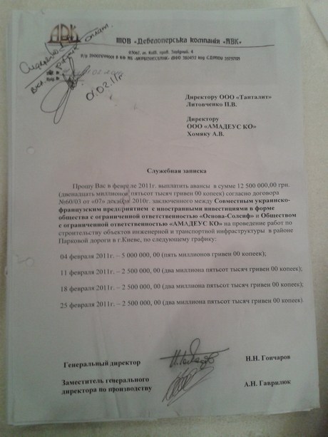 Як зазначає видання, у службовій записці від 1 лютого 2011 року директор девелоперської компанії "АВК" інформує керівників ТОВ "Танталіт" Павла Литовченка і ТОВ "Амадеус ко" Олександра Хомяка про необхідність виплатити 12,5 млн гривень компанії "Основа-Солсіф" у якості авансу на будівництво об’єктів в районі Паркової дороги.
