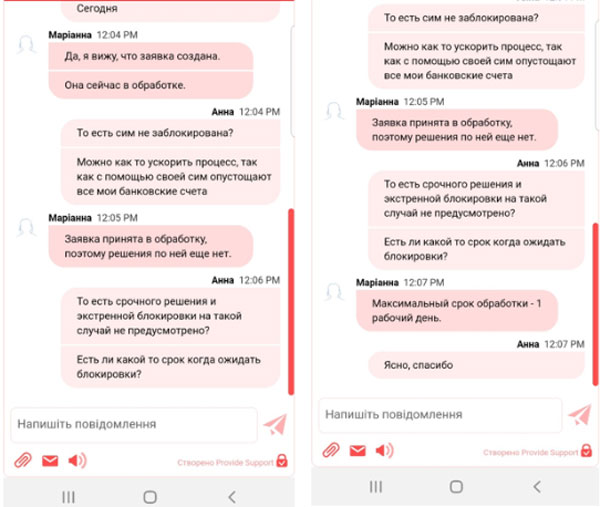 «Не успела я расслабиться как мои родители пишут, что снова видят меня онлайн в вайбере. Я обращаюсь в колл-центр и, о чудо! Кто то разблокировал мою “симку” онлайн, без прихода в отделение после того, как я уведомила компанию Vodafone Ukraine о мошенничеств с ее помощью», − пишет она. Более того, после угона карты ее семье начали поступать странные звонки и сообщения, например, от ее имени спрашивали у родителей адрес ее донецкой прописки.