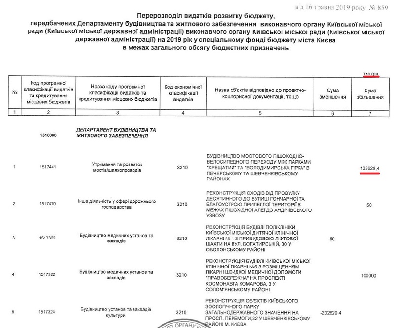 Согласно изменениям в бюджете, на 232,63 млн грн было уменьшено финансирование реконструкции Киевского зоопарка, но на 132,63 млн грн увеличены расходы на строительство моста, и на 100 млн грн увеличена стоимость реконструкции здания Киевской городской клинической больницы №6 на проспекте Космонавта Комарова, 3.