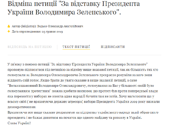 Также на сайте опубликованы петиции, в которых речь идет о том, что нужно отменить петицию об отставке президента. Инициатор отметил, что петицию об отставке Зеленского написали коррупционеры.