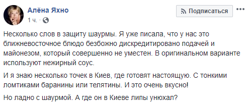 "Несколько слов в защиту шаурмы. Я уже писала, что у нас это ближневосточное блюдо безбожно дискредитировано подачей и майонезом, который совершенно не уместен. В оригинальном варианте используют нежирный соус. И я знаю несколько точек в Киев, где готовят настоящую. С тонкими ломтиками баранины или телятины. И это очень вкусно! Но ладно с шаурмой. А где он в Киеве липы унюхал?"