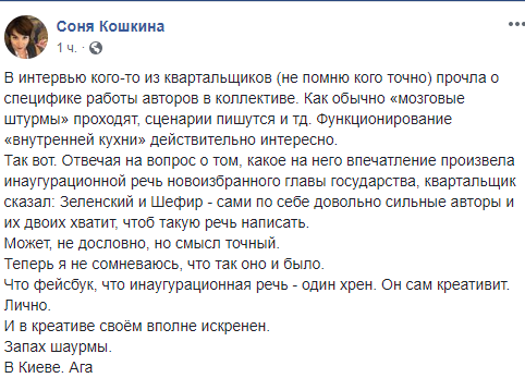 "В интервью кого-то из квартальщиков (не помню кого точно) прочла о специфике работы авторов в коллективе. Как обычно "мозговые штурмы" проходят, сценарии пишутся и тд. Функционирование "внутренней кухни" действительно интересно. Так вот. Отвечая на вопрос о том, какое на него впечатление произвела инаугурационной речь новоизбранного главы государства, квартальщик сказал: Зеленский и Шефир - сами по себе довольно сильные авторы и их двоих хватит, чтоб такую речь написать. Может, не дословно, но смысл точный.