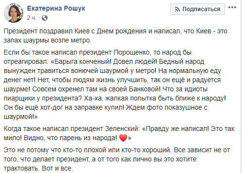 "Президент поздравил Киев с Днем рождения и написал, что Киев - это запах шаурмы возле метро. Если бы такое написал президент Порошенко, то народ бы отреагировал: "Барыга конченый! Довел людей! Бедный народ вынужден травиться вонючей шаурмой у метро! На нормальную еду денег нет! Нет, чтобы людям жизнь улучшить, так он ещё и радуется шаурме! Совсем охренел там на своей Банковой! Что за идиоты пиарщики у президента? Ха-ха, жалкая попытка быть ближе к народу! Он бы ещё хот-дог на заправке купил! Ждем фото показушное с шаурмой!"