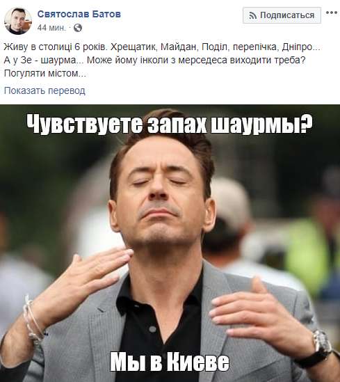 "Живу в столице 6 лет. Крещатик, Майдан, Подол, перепичка, Днепр. А у Зе - шаурма. Может ему иногда из мерседеса выходить надо? Погулять по городу", - написал он.