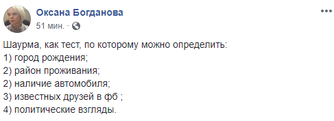 Журналист Оксана Богданова в сети написала, что шаурма, как тест, по которому можно определить: город рождения, район проживания, наличие автомобиля, известных друзей в Facebook политические взгляды.