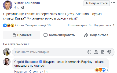 "Я понимаю еще "Киевская перепичка" возле ЦУМа. Но чтобы шаурма - символ Киева? Мы живем точно в одном городе?" - написал он в Facebook.