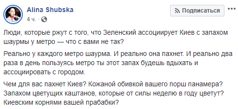 "Люди, которые ржут с того, что Зеленский ассоциирует Киев с запахом шаурмы у метро — что с вами не так? Реально у каждого метро шаурма. И реально она пахнет. И реально два раза в день пользуясь метро ты этот запах будешь вдыхать и ассоциировать с городом.