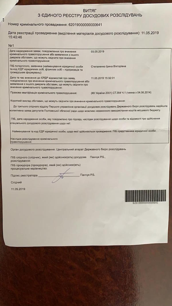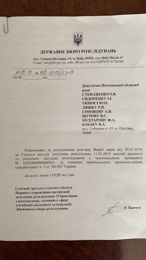 Всі наявні матеріали щодо зловживань голови Полтавської обласної ради Олександра Біленького будуть офіційно долучені до кримінального провадження № 62019000000000641, повідомлення про внесення в ЕРДР від 11.05.2019 р., яке розслідує Державне бюро розслідувань.