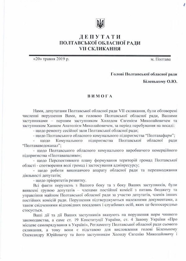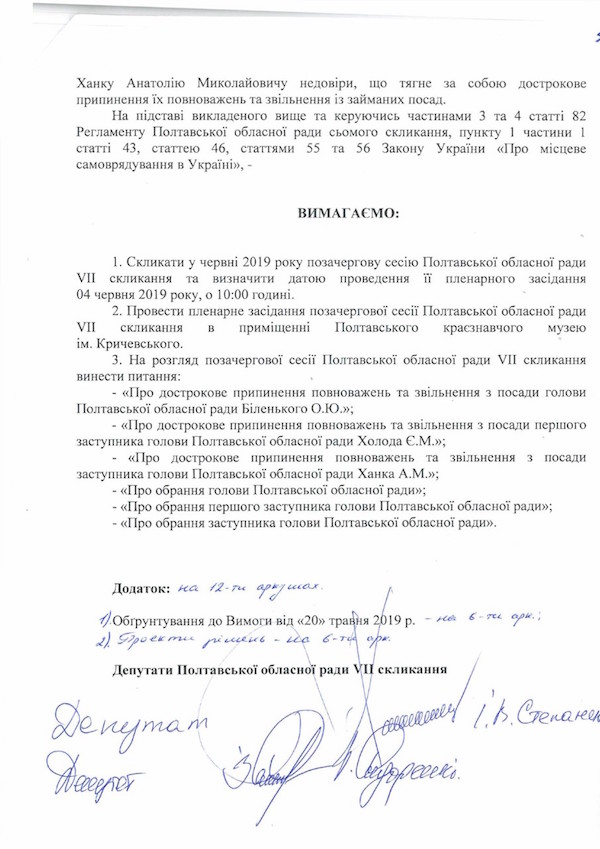На офіційну Вимогу більш ніж третини депутатів обласної ради від 20 травня 2019 року керівництво Полтавської облради згідно з регламентом мало скликати позачергову сесію облради 04.06.2019 р. (четвертого червня 2019 року). І винести на неї питання про дострокове припинення повноважень та звільнення з посади всього керівництва обласної ради та вибори нового керівництва обласної ради. Але керівництво Полтавської облради в особі Олександра Біленького вдалося до перешкоджання діяльності депутатів місцевої ради (ст. 351 КК України), зловживання службовим становищем (ст. 364 КК України) і службової підробки (ст. 366 КК України).