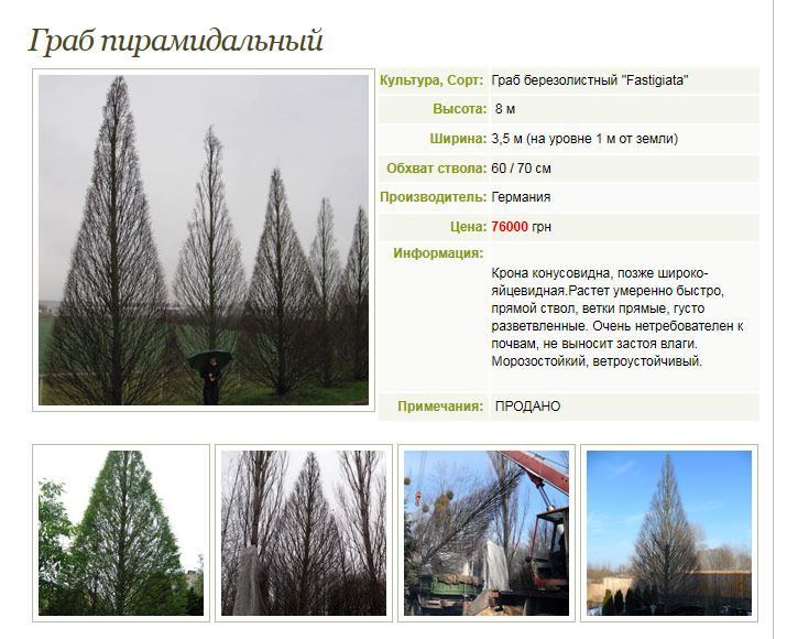 За 11 грабов «Фастигиата» 8 м высотой и 25 см толщиной с четырьмя формированиями корневой системы заплатили 294 000 грн за штуку вместо рыночных 76 000.