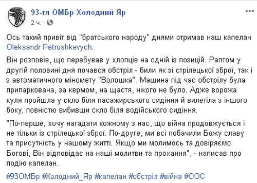 Пуля прошила салон насквозь: авто капеллана попало под обстрел на Донбассе