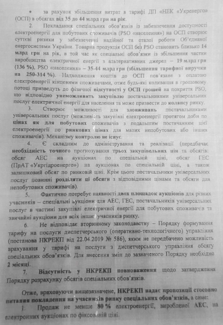 "НКРЭКУ предоставляет предложения относительно вопроса возложение на участников рынка специальных обязанностей, а именно: 1. продажа не менее 80% электричества, произведённого АЭС, на электронных аукционах по фиксированной цене 2. продажа не менее 50% электричества, произведённого ГЭС, на электронных аукционах по фиксированной цене 3. закупка поставщиком универсальных услуг на электронных аукционах определенного объема электрической энергии 4. закупка операторами сетей (ОСП и ОСР) на электронных аукционах определенного объема электрической энергии в целях компенсации технологических потерь электрической энергии на ее передачу/распределение; 5. обязать АЭС заказывать в ПУП и оплачивать услуги по обеспечению доступности электроэнергии для бытовых потребителей", - говорится в письме.