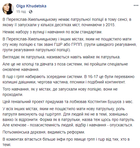 “В Переяслав-Хмельницком нет патрульной полиции в том смысле, в котором ее запускали в нескольких десятках городов, начиная с 2015. Нет набора с улицы и обучения по всем стандартам. В Переяслав-Хмельницком и других городах, которым не повезло иметь эту новую полицию, есть так называемые ГБР или ГРПП (Группы быстрого реагирования, группы реагирования патрульной полиции)”, - написала журналистка Ольга Худецкая.