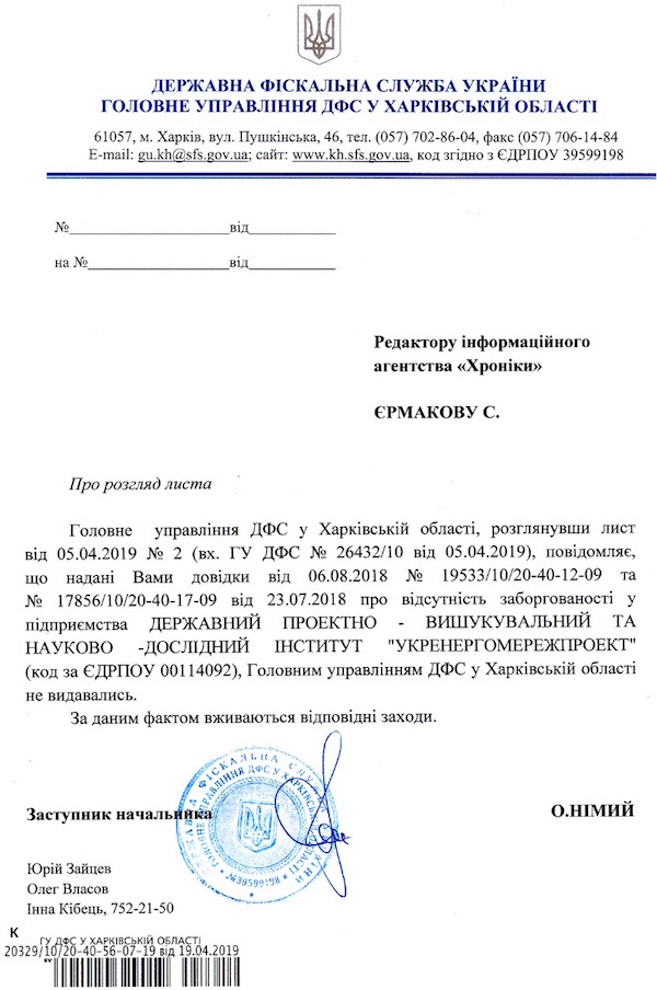 Беглый поиск по сайту управления ГФС выдает результат – Наталья Светош, якобы подписавшая справки, работает в фискальной службе. Только ее должность – начальник Восточного управления, а никак не заместитель начальника ГУ ГФС. Второй подписант оказался однофамильцем и тезкой руководителя всей ГФС. Так совпало…