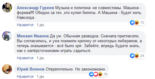 «Зато вы не скур…лись. Спасибо вам за это. Очень рад, что вы есть в моей жизни», «Судя по происходящем событиям им действительно не долго осталось «перезваниваться» и думаю мы очень скоро сможем насладиться вашим творчеством! Спасибо вам за ваши песни и вашу гражданскую позицию!», «Музыка и политика — не совместимы. Машина — форева!!!! Обидно за тех ,кто купил билеты. А Машина — будет жить. Навсегда», «Отвратительно. Но закономерно», «Да уж. Обычная разводка. Сначала пригласили, Вы согласились, и уже поимели критику от некоторых либералов, а теперь оказывается — всё было зря. Забейте, впредь будете знать, как с напёрсточниками играть садиться» — отмечали поклонники.