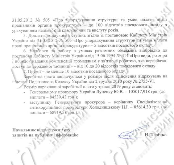 В ответе Генпрокуратуры также указывается, что оклад главы САП составил 63,4 тысячи грн.