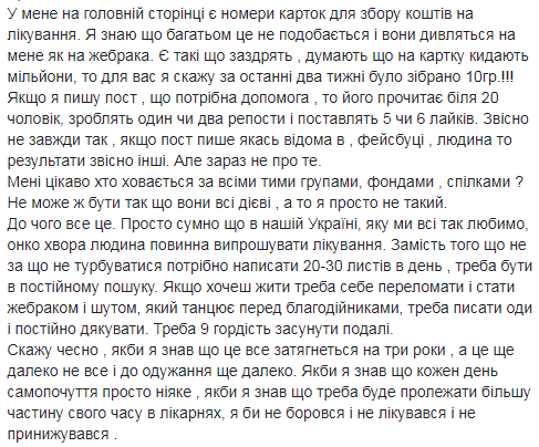 "У меня на главной странице есть номера карточек для сбора средств на лечение. Я знаю, что многим это не нравится и они смотрят на меня как на нищего. Есть такие что завидуют, думают что на карту бросают миллионы, то для вас скажу - за последние две недели было собрано 10 гривен!!! Когда мой пост, нужна помощь, то его прочитает около 20 человек, сделают один или два репоста и поставят 5 или 6 лайков. Конечно не всегда так, если пост пишет какой-то известный в Facebook человек, то результаты конечно другие. Но сейчас не об этом", - отметил Антропов.