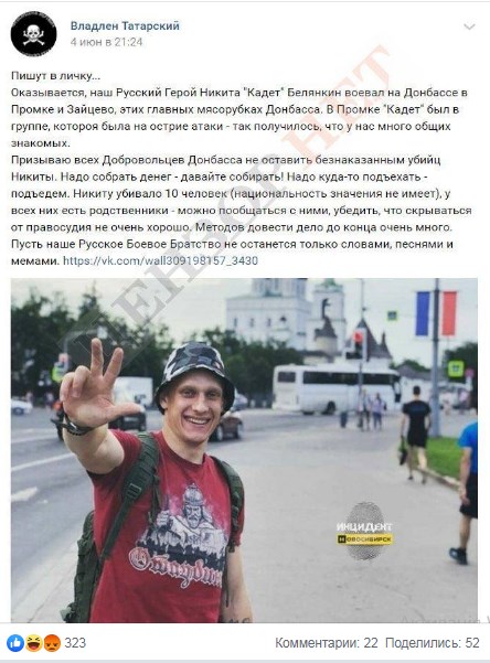 "Оказывается, Белянкин принимал участие в боях на Донбассе - а конкретно в Зайцево и под Авдеевкой, на "промзоне". Очередное свидетельство, что в войне на Донбассе РФ до сих пор широко применяет "отпускников" - а проще говоря, кадровые подразделения военнослужащих, действующих под видом "ополченцев". Контактные бои в промзоне Авдеевки начались в 2016-м году, так что 24-я бригада ГРУ применялась не только в 2014-м", - написал он.