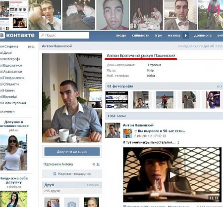 Там він був підписаний, як "Антон Еротичний сміхун Пашинский" та мав фото з відпочинку та розваг, а також із батьками.
