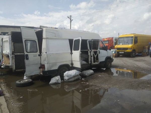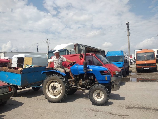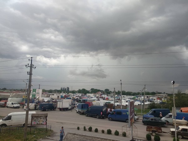 Температура 32 градуса после обеда сменяется другой крайностью. Небо затягивает облаками, ветер заставляет тополя клониться. Небо взрывается дождем, он бьет по фурам и легковым автомобилям, которые ожидают своей очереди заехать на территорию, а пока стоят в пробках, не хуже, чем в Киеве. Цветные на расстоянии клочки тех, что припаркованы на рынке, заволакивает серой пеленой дождя.