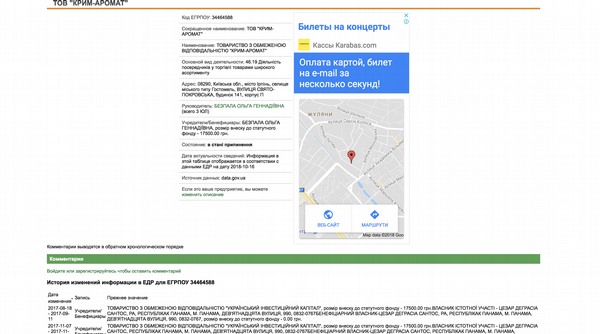 Так, в Украине существует свое предприятие “Крым-аромат”. По странному совпадению в базах данных ее адрес находится в том же помещении, что и офис Адамовского — Жилянская 75, бизнес-центр ”Евразия”.
