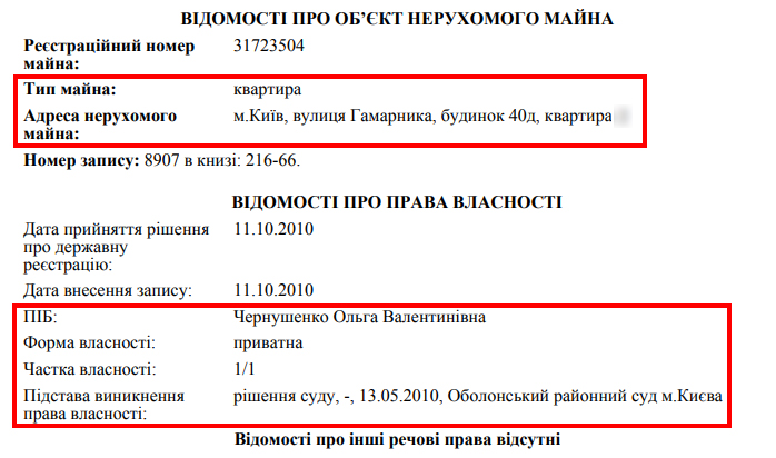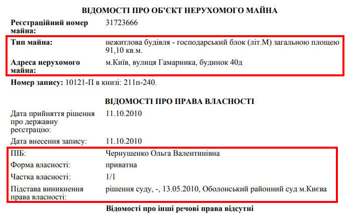 Колишнє, начебто, подружжя Чернушенків змогло нажити чималий будинок у селі Горенка неподалік Києва. Згодом його разом із земельною ділянкою 0,18 га переписали на неповнолітню дочку Домініку. У часи, коли долар був по вісім гривень, майно мало ціну 214 тис. дол. США.