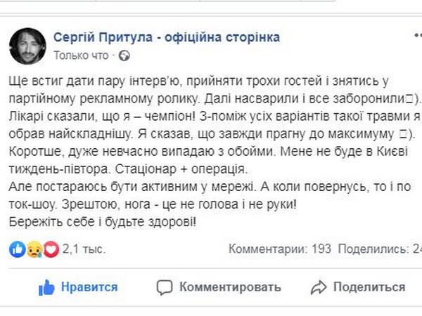 «Врачи сказали, что я — чемпион! Среди всех вариантов такой травмы я выбрал самый сложный. Я сказал, что всегда стремлюсь к максимуму. Корче, очень не вовремя выпадаю из обоймы. Меня не будет в Киеве неделю-полторы. Стационар + операция. Но я постараюсь быть активным в сети. А когда вернусь, то и по ток-шоу. В конце-концов, нога — это не голова и не руки! Берегите себя и будьте здоровы!», — написал Сергей Притула.