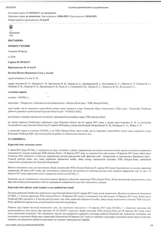 Буквально позавчера, 24 июня 2019 г. судья Хозяйственного суда Одесской области Рога Н.В., которая, важно отметить, не подтвердила своей профессиональной пригодности занимаемой должности, оставила без рассмотрения иск «Лагуна-Рени». Основанием, якобы для оставления иска без рассмотрения было то, что, будто, представители «Лагуна-Рени» не имели права подавать в интересах предприятие такой иск.