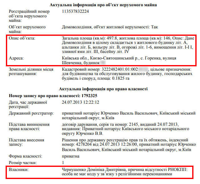 Якобы бывшая супружеская чета Чернушенко смогла нажить большой дом в селе Горенка под Киевом. Впоследствии его вместе с земельным участком 0,18 га переписали на несовершеннолетнюю дочь Доминику. Во времена, когда доллар был по восемь гривен, имущество имело цену 214 тыс. долл. США.