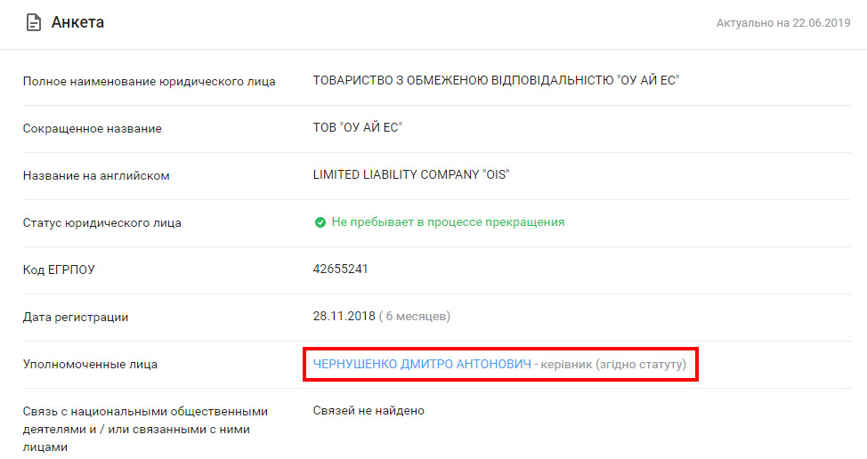 По данным реестра юридических лиц, Чернушенко Дмитрий Антонович сейчас является директором созданного в 2018 году ООО «ОУ АЙ ЭС», специализирующегося на торговле.