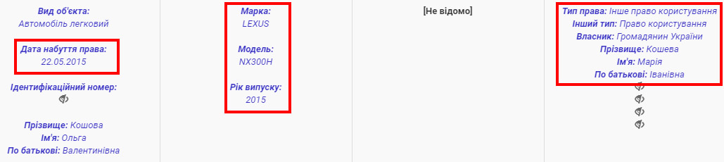 В прошлогодней декларации Ольги Кошовой (Кошевой) вписана единственная машина - Lexus NX300H 2015 год выпуска. Подержанный автомобиль такой модели стоит более миллиона гривен. Записан он на маму - Кошевую (Кошову) Марию Ивановну, предыдущим местом работы которой является Киевская центральная клиническая больница МОЗ Украины.