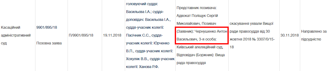 Напомним, летом 2015 года состоялся громкий обыск с участием ГПУ и СБУ в рабочем кабинете Антона Чернушенко, который находился в помещении Апелляционного суда Киева. Главу ведомства подозревали в незаконном вмешательстве в автоматизированную систему распределения дел. Якобы он в ручном режиме решал, кому отдавать на рассмотрение дела и кого назначать председателем. На видео, снятом правоохранителями, был показан следственный эксперимент с программой автораспределения. Она позволяла хитрыми манипулированиями сформировать отчет с «нужным» составом суда. Также в кабинете нашли талоны на 14,5 тонн горючего, ключи от трех элитных автомобилей, доллары, решение в производстве, вынесенное до заседания суда, и дела, в которых надо было принять конкретные решения.