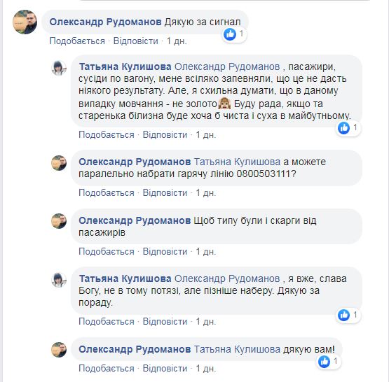 В комментарии к этому посту пришел и журналист Александр Рудоманов, который работает в «Укрзализнице» и часто отвечает на негативные отклики пассажиров, советуя, как поступить в том или ином случае.