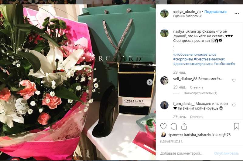 Настя все время писала, что ее любимый муж Виталий балует ее подарками. Ни одна неделя не обходится без цветов, и он готов потратить на нее все деньги. И публиковала фото подарков.