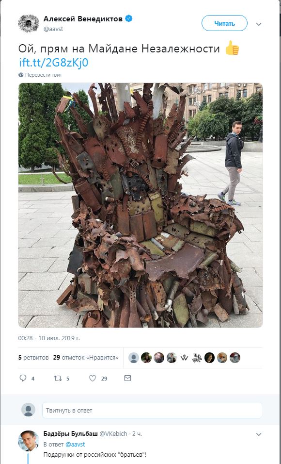 Также Алексей Венедиктов поделился в социальных сетях фотографиями, сделанными во время прогулки по Киеву. Одна из них — «Железный Трон», собранный из обломков военной техники из зоны проведения операции Объединенных сил на Донбассе. Инсталяцию создали из обломков танковой брони, частей подбитой военной техники, пулеметных ленты, снарядов, канистр и солдатских фляг.