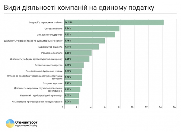 Найбільша кількість компаній на єдиній системі оподаткування займається операціями з нерухомим майном (14%). На другому місці — оптова торгівля (7,8%), сільське господарство (7,5%) і діяльність у сфері права та бухгалтерських послуг (5,7%).