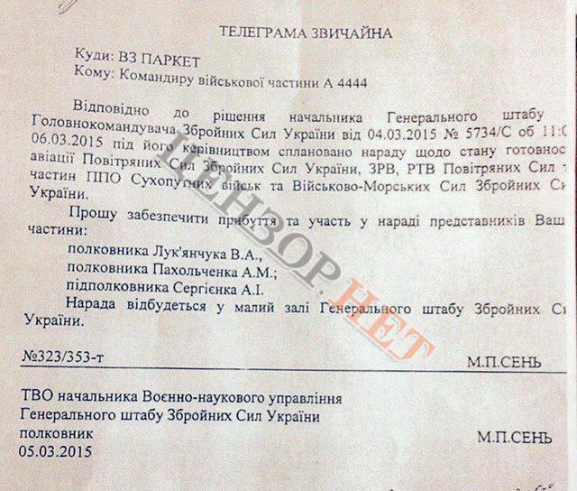 “Согласно решению Начальника Генерального штаба – Главнокомандующего Вооруженных сил Украины от 04.03.2015… прошу обеспечить прибытие и участие в совещании представителей Вашей части: