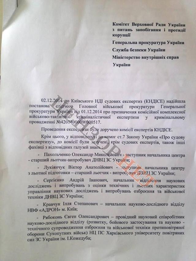 2 декабря 2014 года в Киевский институт судебных экспертиз поступило постановление следователя главной военной прокуратуры о назначении комплексной военно-тактической криминалистической экспертизы по делу о гибели Ил-76.