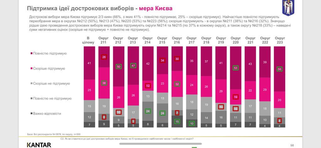 Кроме того, досрочные выборы мэра Киева поддерживает 2/3 киевлян (66%, из которых 41% - полностью поддерживает, 25% - скорее поддерживает).