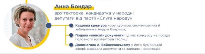 Во втором случае мы говорим об Анне Бондарь, рвущейся в парламент по 220-му мажоритарному округу в Киеве (Подол, Виноградарь, Куренёвка и далее) также от “Слуги народа”. Архитектор по образованию, она известна своими тесными рабочими отношениями с Ваврышем в его бытность начальником “строительного” департамента КГГА. В киевской прессе её прямо называют протеже и даже креатурой девелопера.