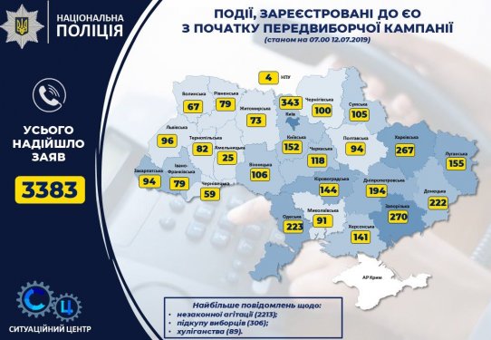 «С начала предвыборной кампании внеочередных парламентских выборов полиция уже зарегистрировала 3383 обращения о нарушении избирательного законодательства. Открыто 167 уголовных производств и составлен 695 админпротоколов. Только за минувшие сутки, 11 июля, зафиксировано 324 сообщений, открыто 25 уголовных производств и составлен 101 административный протокол. Это говорит о том, что за эти 10 дней, судя по вчерашним суткам, мы будем проходить пик кампании, которая закончится уже в следующую пятницу», – сказал Иван Стойко.