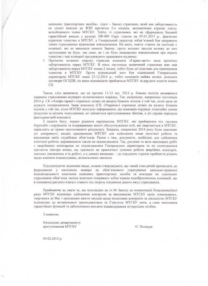 9 февраля начальник департамента урегулирования МТСБУ Алексей Полищук написал письмо Сергею Рыбалка, как Главе Координационного совета МТСБУ. По его словам, «ситуация, которая сложилась в последнее время вокруг Моторного страхового бюро, вызывает серьезные опасения как среди страховиков, таки и среди потерпевших».