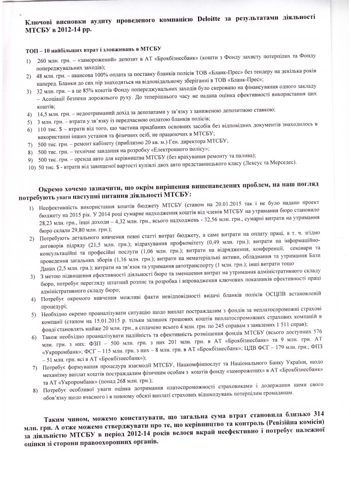 В распоряжении нашего издания есть материалы, основанные на выводах предыдущего аудита деятельности МТСБУ за 2012-2014 годы, проведенного компанией Deloitte. Основной вывод аудита - общая сумма потерь составила 314 млн. грн. А, значит, руководство и контроль (со стороны Ревизионной комиссии) за деятельностью МТСБУ в этот период велся крайне неэффективно и требует соответствующей оценки со стороны правоохранительных органов. В СМИ было множество публикаций о коррупционных аферах, связанных с деятельностью МТСБУ. Но в справке Координационного совета приводится лишь сухое перечисление потерь бюро или финансовых нарушений, которые выявил внешний аудит: