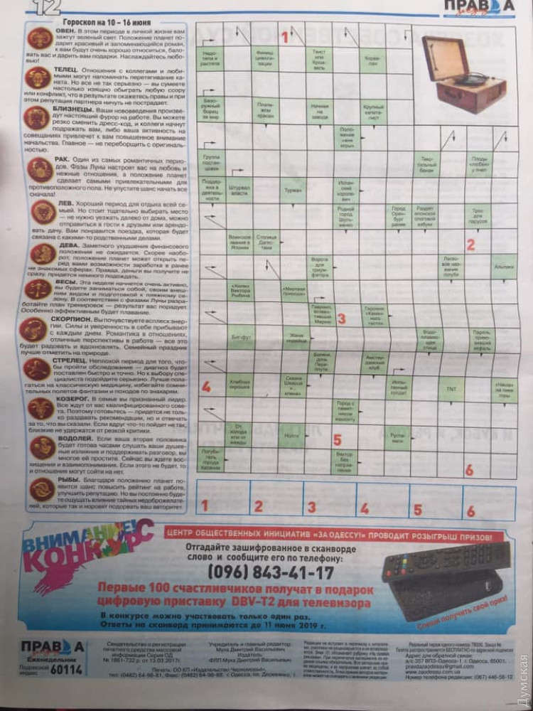 Информация о бесплатном розыгрыше опубликована в газете «Правда за Одессу», где публикуют комплиментарные материалы про Виктора Баранского. Газета предлагает отгадать зашифрованное слово в сканворде и сообщить его по номеру телефона.