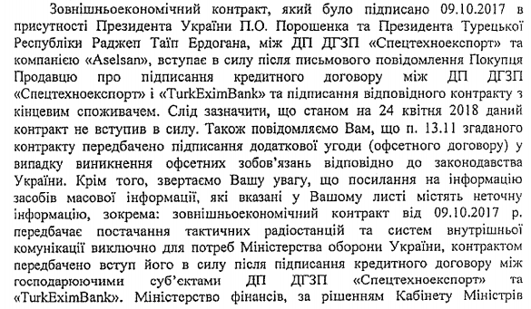 Також у наведених матеріалах йдеться про зацікавленість військової прокуратури зовнішньоекономічним контрактом, який був підписаний у жовтні 2017 року між ДП "Спецтехноекспорт" та компанією "Aselsan" в присутності президента України Петра Порошенка та президента Турецької Республіки Раджепа Таїпа Ердогана.