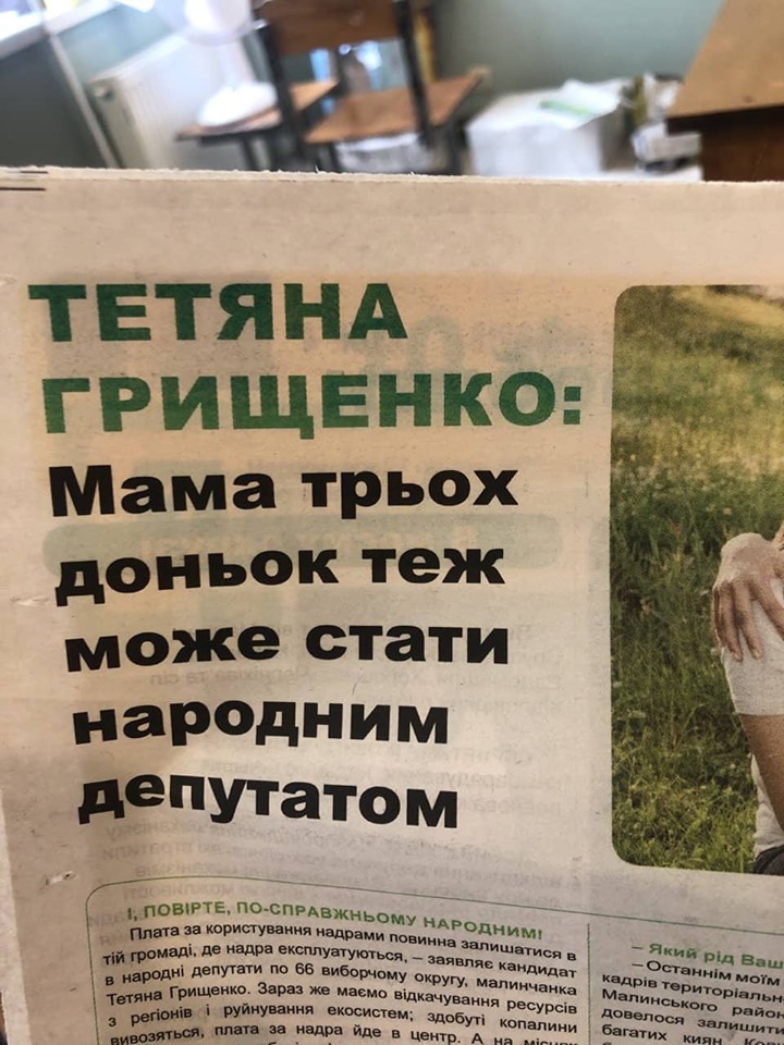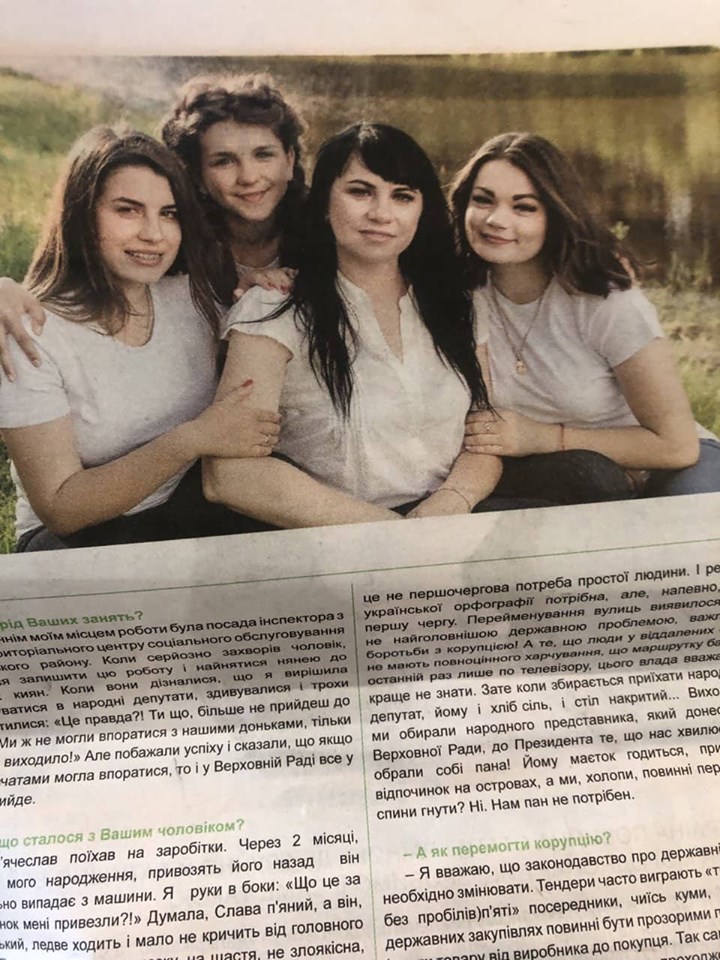 Один із них надіслав нам агітаційну продукцію Тетяни Грищенко, в якій підтверджується вище наведена інформація – кандидатка від «Слуги народу» справді одружена і має трьох доньок.