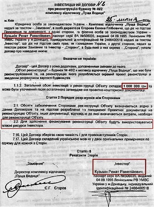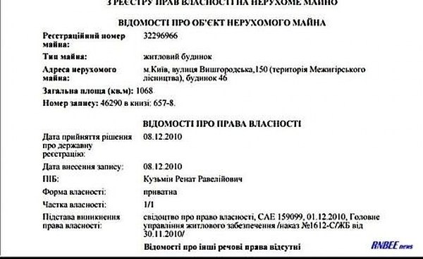 За оказание Леониду Черновецкому многочисленных услуг (в том числе по делу «Элита-Центр») Ренат Кузьмин получил от него поистине княжеский подарок. Сначала Государственное управление делами выделило Кузьмину старую дачу в Пуща-Водице, которую он снес и возвел на её месте хоромы площадью 1068 кв. метров, назвав это «рекострукцией». А затем личным участием киевского мэра этот участок (и построенная на нем «хатынка») оказались в частной собственности Кузьмина. В 2015 году Генпрокуратура пыталась признать эти манипуляции незаконными и отобрать участок, но он уже был записан на Марию Шувалову – тещу Рината Равельевича.