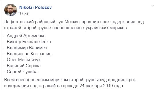 Со временем стало известно о продлении ареста и третей группе моряков, сообщает «Громадське». На три месяца арест продлили Юрию Безъязычному, Юрию Будзило, Владимиру Лисовому, Богдану Небылице, Евгению Семидоцкому, Андрею Эйдеру.
