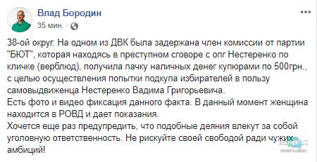 Женщину поймали на горячем при выдаче избирателям денег купюрами по 500 гривен с целью осуществления попытки подкупа избирателей в пользу самовыдвиженца Нестеренко Вадима Григорьевича. Денежные средства были получены от ее подельника.