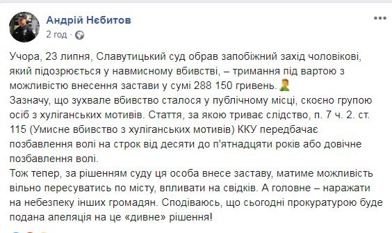 А новый руководитель полиции Киевской области Андрей Небитов уточнил, что сумма залога для подозреваемого в умышленном убийстве составила 288 тысяч 150 гривен. «Отмечу, что дерзкое убийство произошло в публичном месте, совершено группой лиц из хулиганских побуждений. Статья, по которой ведется следствие — п. 7 ч. 2. ст. 115 (Умышленное убийство из хулиганских побуждений) УК — предусматривает лишение свободы на срок от десяти до пятнадцати лет или пожизненное лишение свободы», — пишет правоохранитель на своей страничке в Facebook и выражает надежду, что прокуратура подаст апелляцию на это «странное решение».